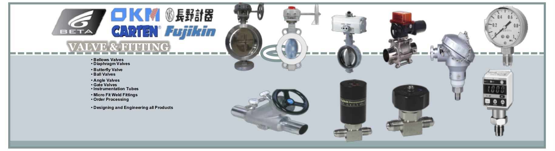 高純不銹鋼EP、BA/MP、AP等級(jí)管子/管道/管件;高純不銹鋼隔膜閥、波紋管閥、蝶閥、球閥、針閥、調(diào)壓閥等等;超純VCR、焊接、卡套接頭;以及設(shè)備應(yīng)用材料:壓力傳感器、壓力表、鋼瓶電子稱、火焰探測(cè)器、氣體探測(cè)器、鋼瓶緊急切斷裝置、加熱毯、加熱線、PTFE保溫纏繞帶;化學(xué)品供應(yīng)系統(tǒng)中的PFA閥門(mén)以及括口和焊接接頭,不銹鋼內(nèi)襯PFA/PTFE管道、閥門(mén)、接頭等配件。